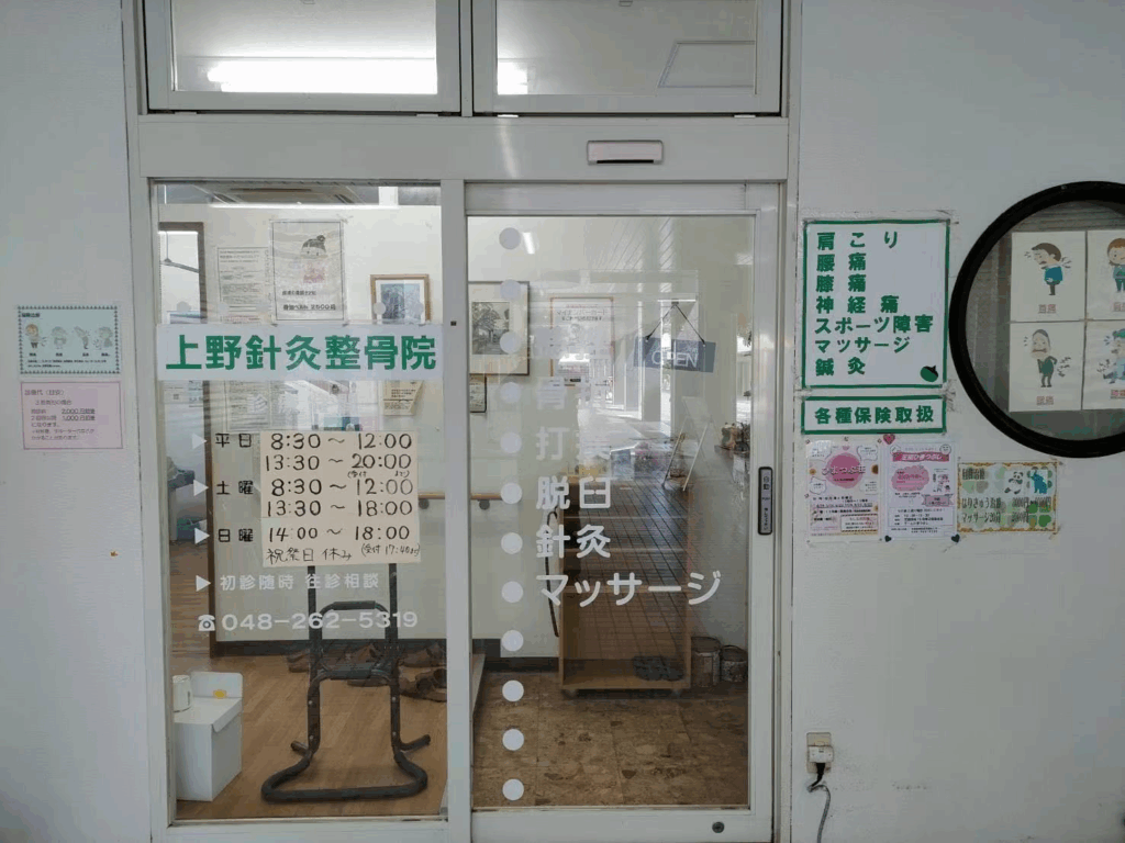 HOME店舗 上野鍼灸整骨院 目次 [ open close ] 店舗紹介営業時間サービス内容連絡方法店内写真アクセス 店舗紹介 20年以上芝園団地で営業しています。 首、肩、腰、膝の痛み、スポーツ障害、捻挫、脱臼など治療しております。 営業時間 月〜金 8:30 – 12:00 , 13:30 – 20:00 土 8:30 – 12:00 , 13:30 – 18:00 日 14:00 – 18:00 休み:祝日、月末日曜日 サービス内容 保険診療(捻挫、脱臼) 実費診療(鍼灸) 連絡方法 ホームページ: https://www.ueno-seikotu.com/ 店内写真 アクセス 閲覧数: 186